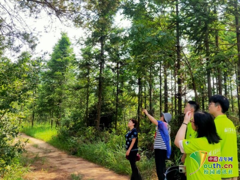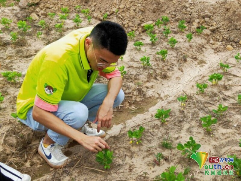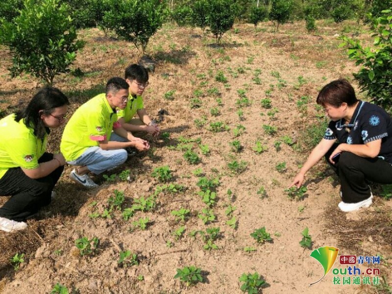图为队员观察大豆的长势。中国青年网通讯员 喻梦霖 供图